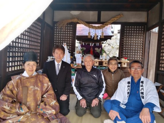 尾道市西久保町の久保八幡神社(永井飾里宮司)境内にある松尾神社で4月2日、例祭が行われた=写真。