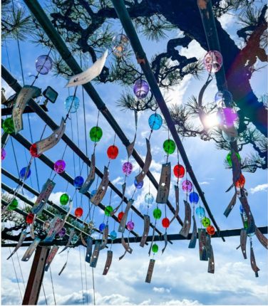風鈴は本堂と玉の岩の間の休憩スペースに吊るされ、腰掛に座って尾道水道の景色とともに楽しめる。風鈴は授与所で1700円を払い、短冊に願いをしたため奉納する。10月18日まで。