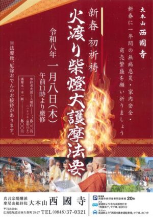 西國寺(尾道市西久保町29―27)は1月8日(水)11時から、「初祈祷火渡り柴燈大護摩法要」を執り行う。