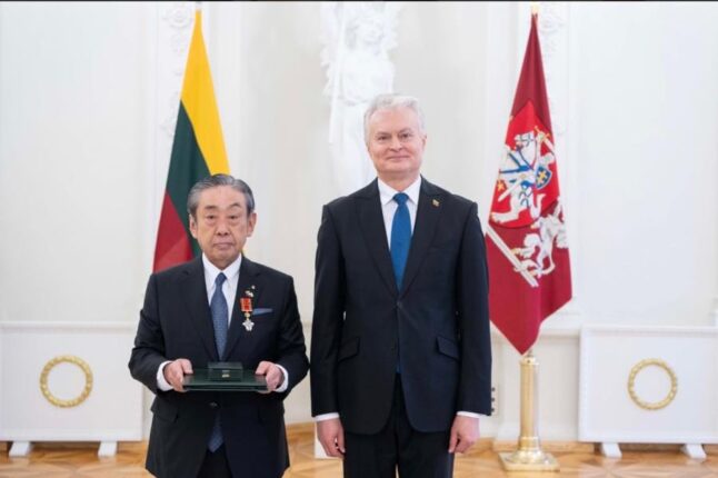 在福山リトアニア共和国名誉総領事の小丸成洋氏(福山通運㈱代表取締役会長)は2月16日、リトアニア共和国大統領府でギタナス・ナウセーダ大統領から国家勲章「リトアニアへの功績」オフィサー十字勲章を授与された。同勲章は同国憲法と国家表彰法に基づき、リトアニアへの顕著な功績を有する人物に授与される。